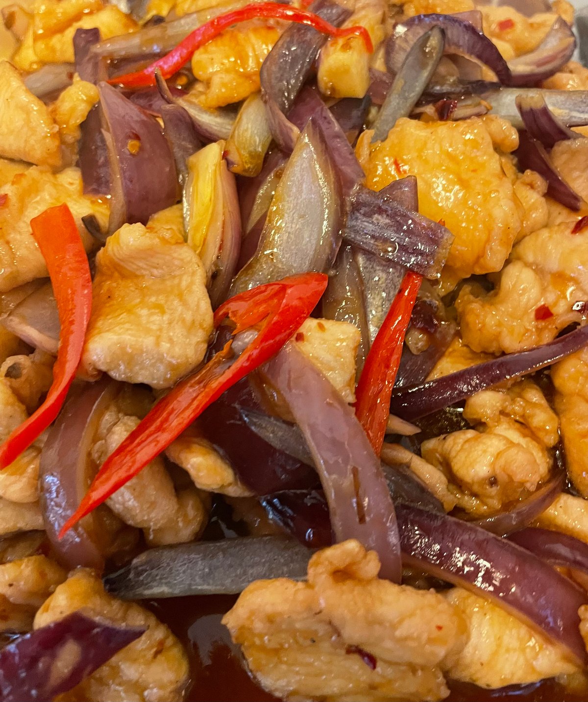 Wok kylling med prikpao paste,løk,østers saus, soya saus.Serveres med ris.