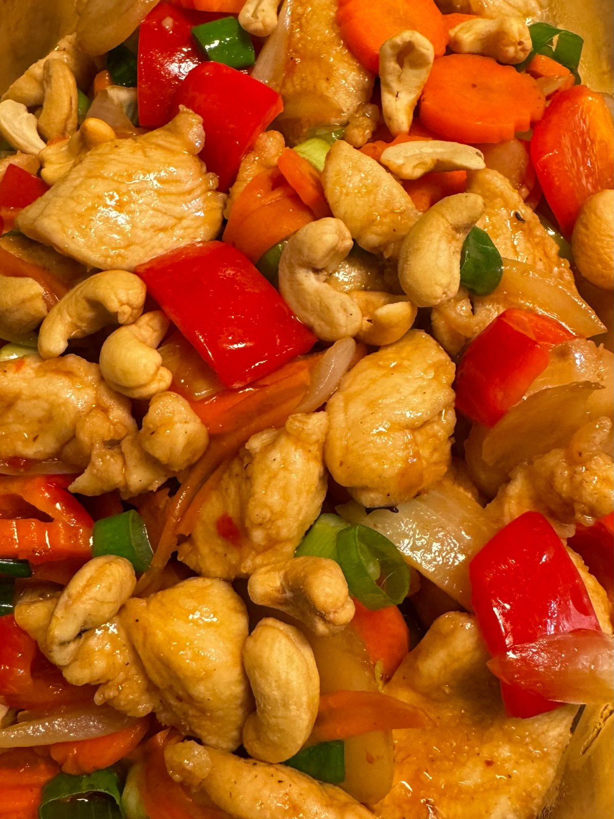 Wok kylling med østers saus,soya saus,paprika ,løk,gulrøtter ,cashewnøtter m.m. Serveres med ris.