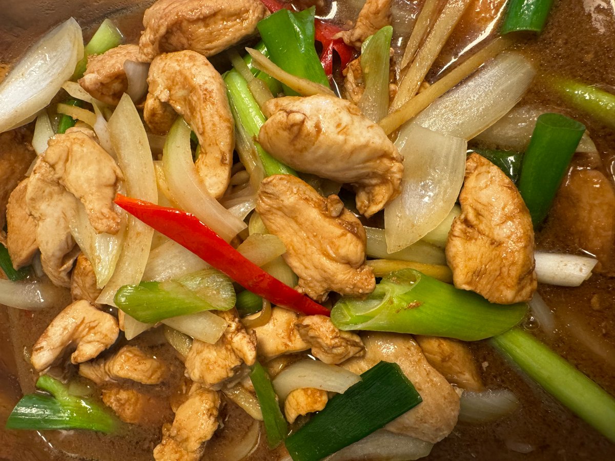 Wok kylling eller svinekjøtt med ingefær,østers saus,soya,løk,hvitløk.