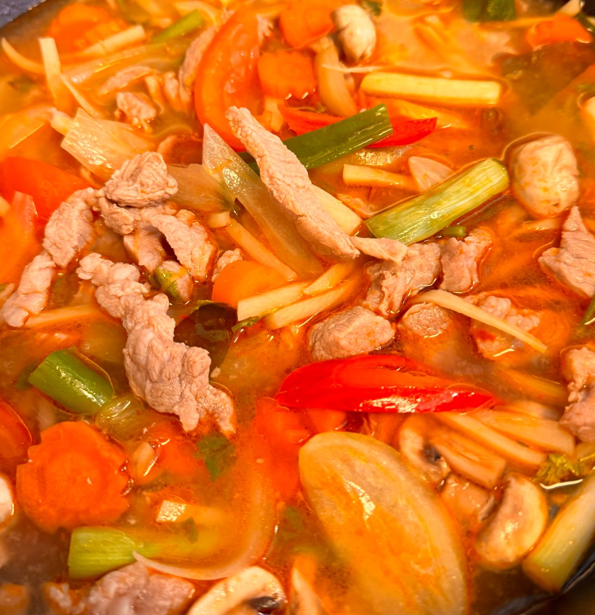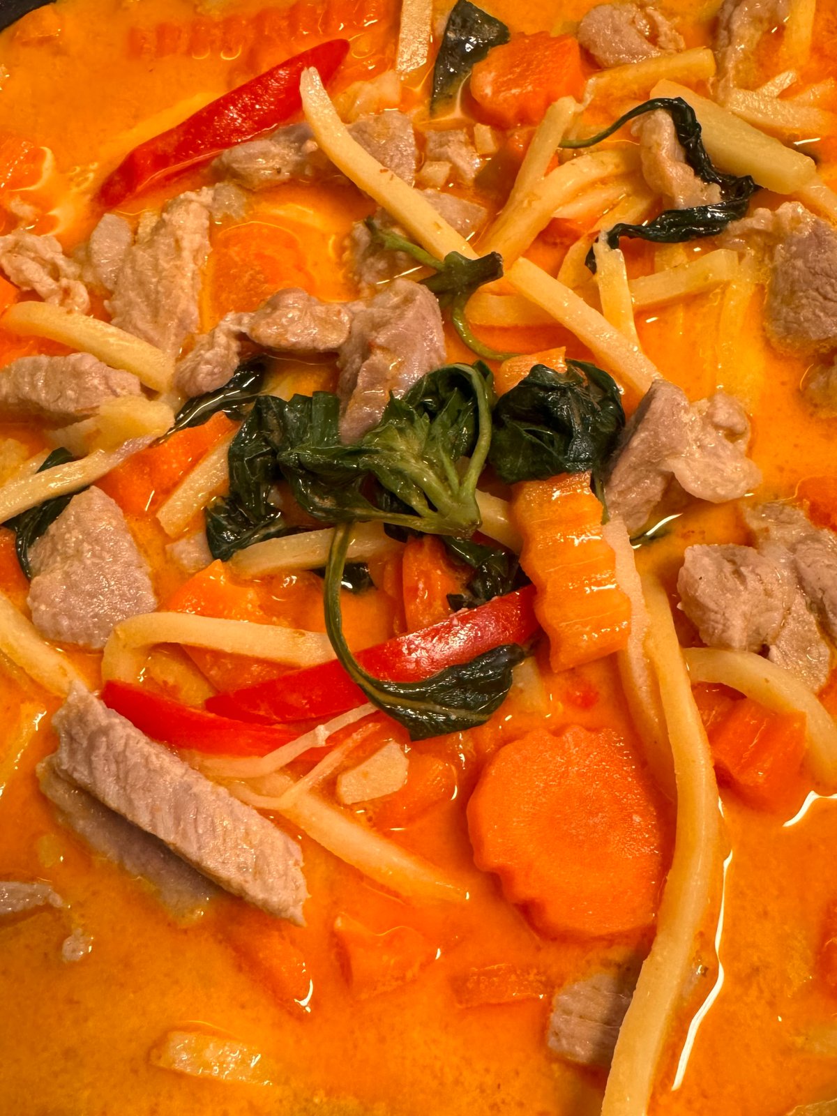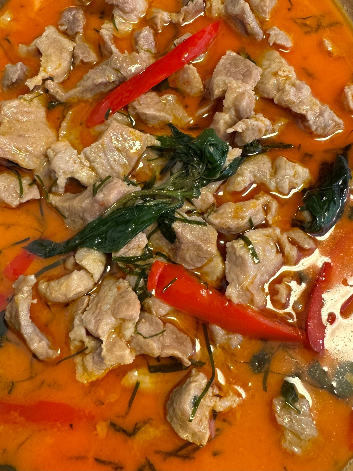 En type gryte med Panaeng karri, svinekjøtt eller kylling,kokosmelk ,sitronblad,sweet basilikum .