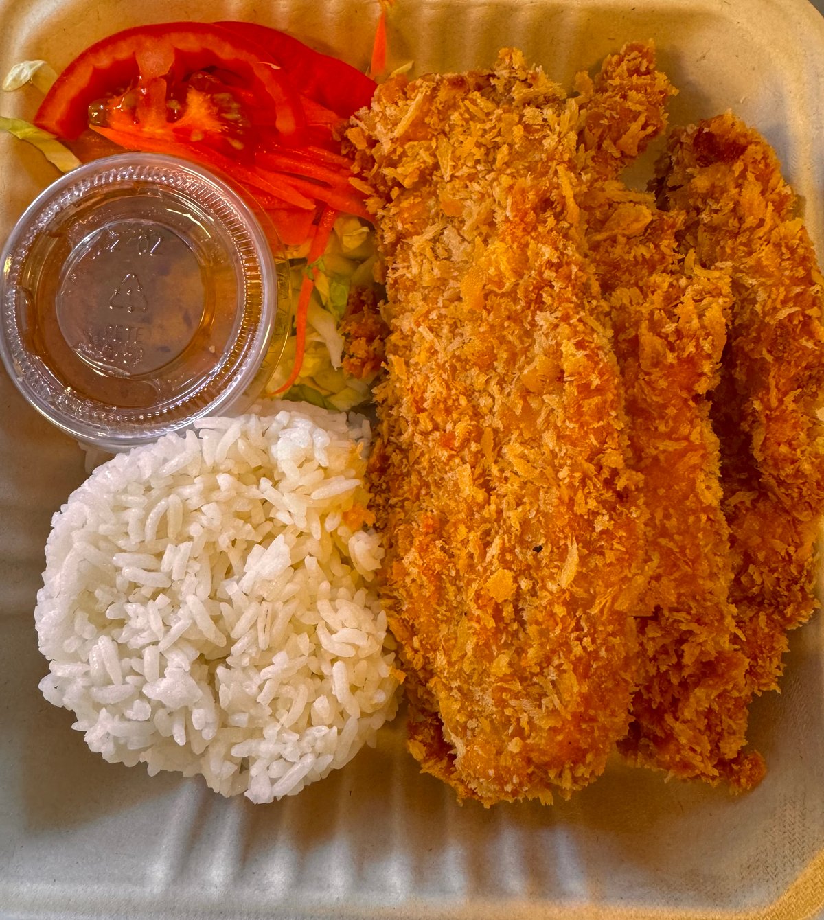 En stk. fritert kyllingbryst med smulebrød, pepper, soya og østerssaus.