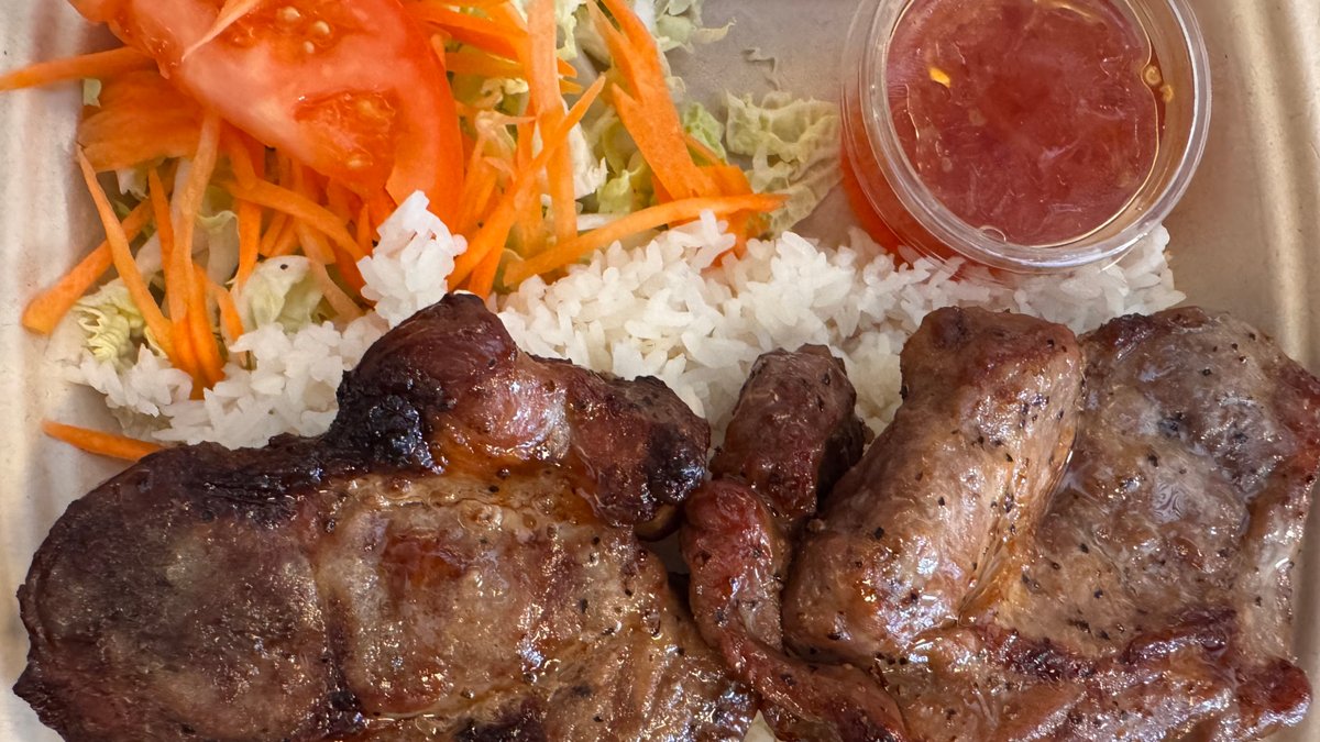 Tallerken med 2 stk. nakkekoteletter marinert med salat, ris og chilisaus.Erstatter grillspyd.