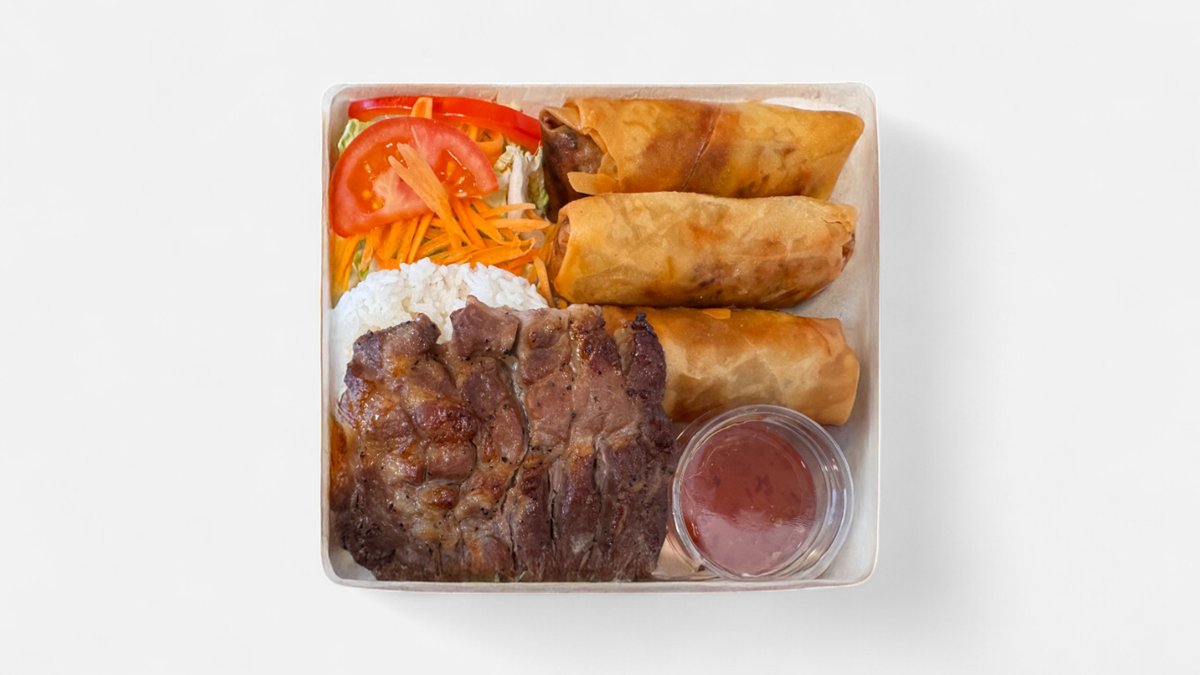 3 stk. vårruller og 1 stk. grill kotelett med ris, salat og chilisaus.