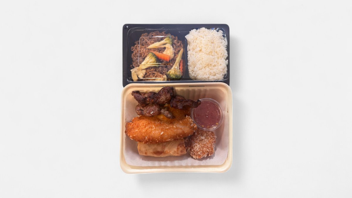 10 vårruller,5 stk.innbakt kylling, 2 stk.grill nakkekoteletter,2 porsjoner ris og 2 chili saus.