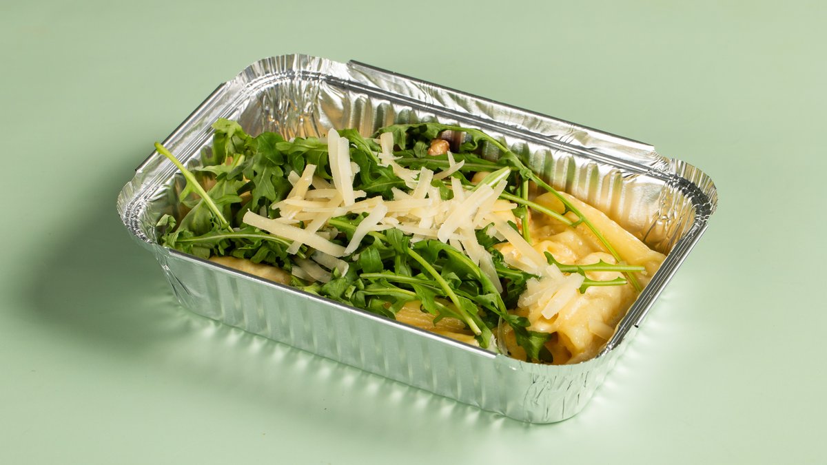 Penne med fløtesaus, stirmlet kyllingfilet, ruccola og parmesan.