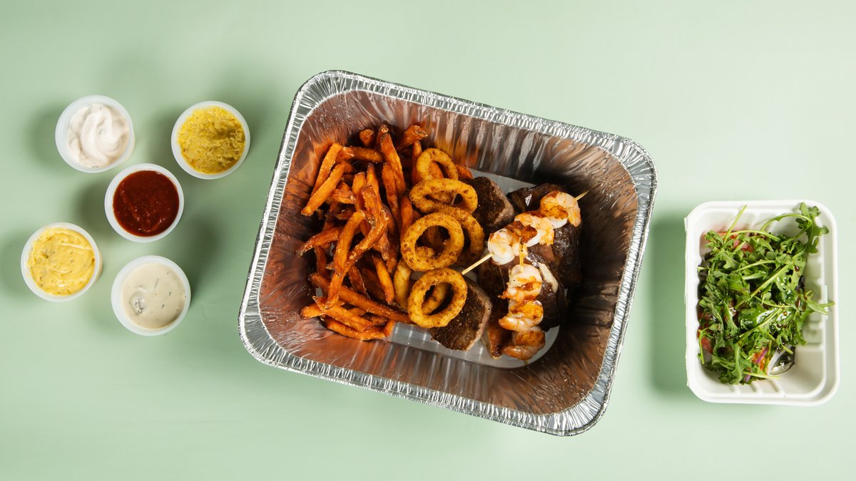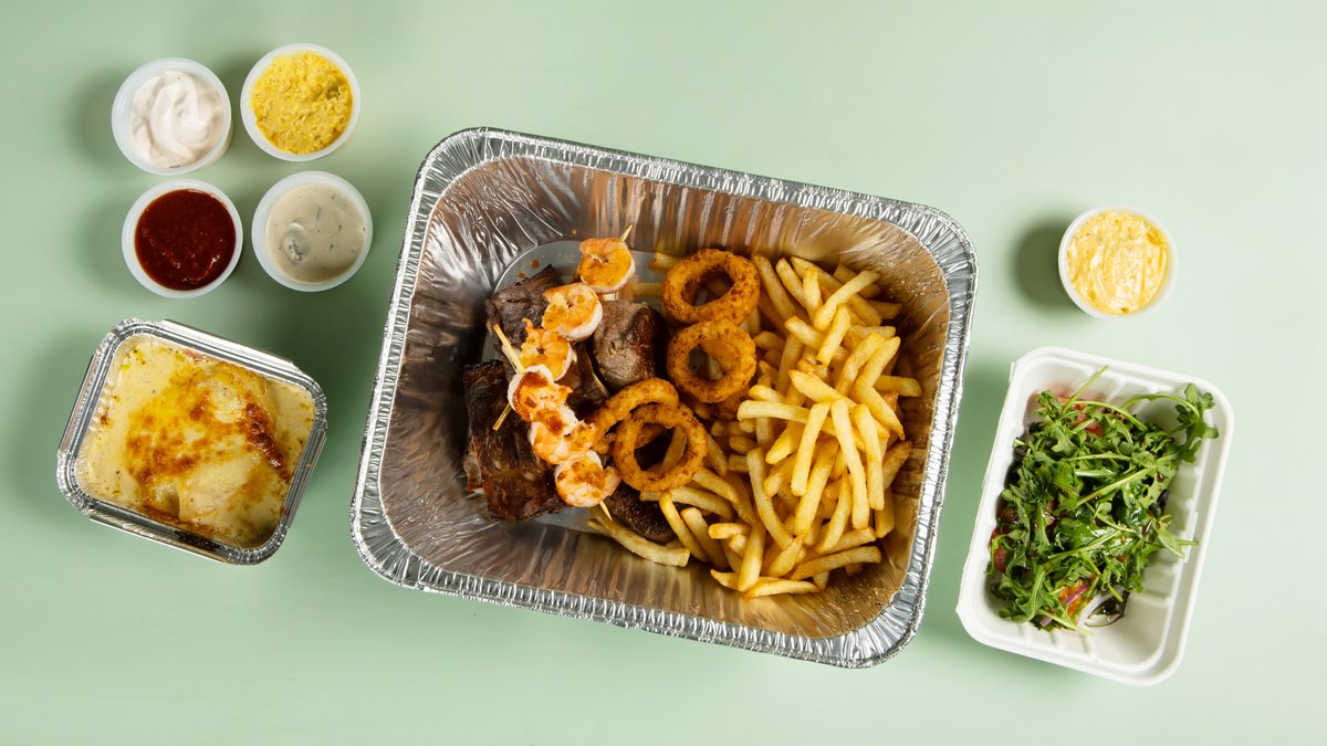 Indrefilet, kyllingfilet, scampi, spareribs, tomatsalat, bearnaisesaus, soppstuing, maiskrem, bbq, hvitløksdressing, tortillachips, løkringer og søtpoteter. Måltid for 2 stykk eller flere.