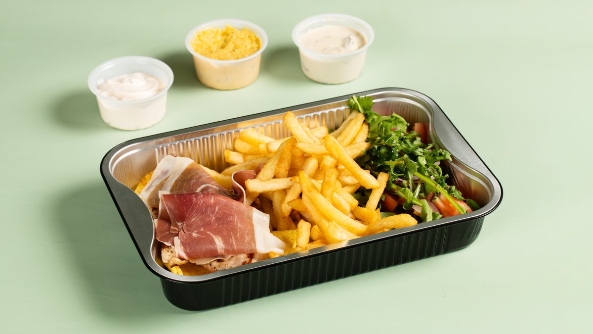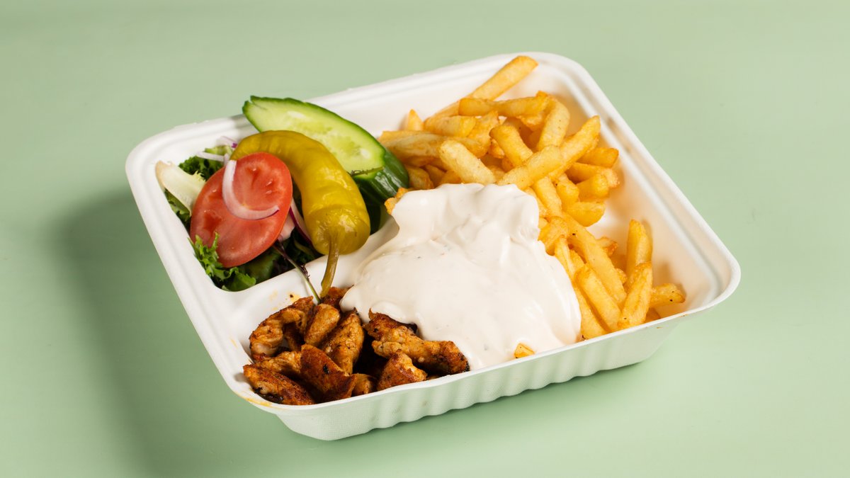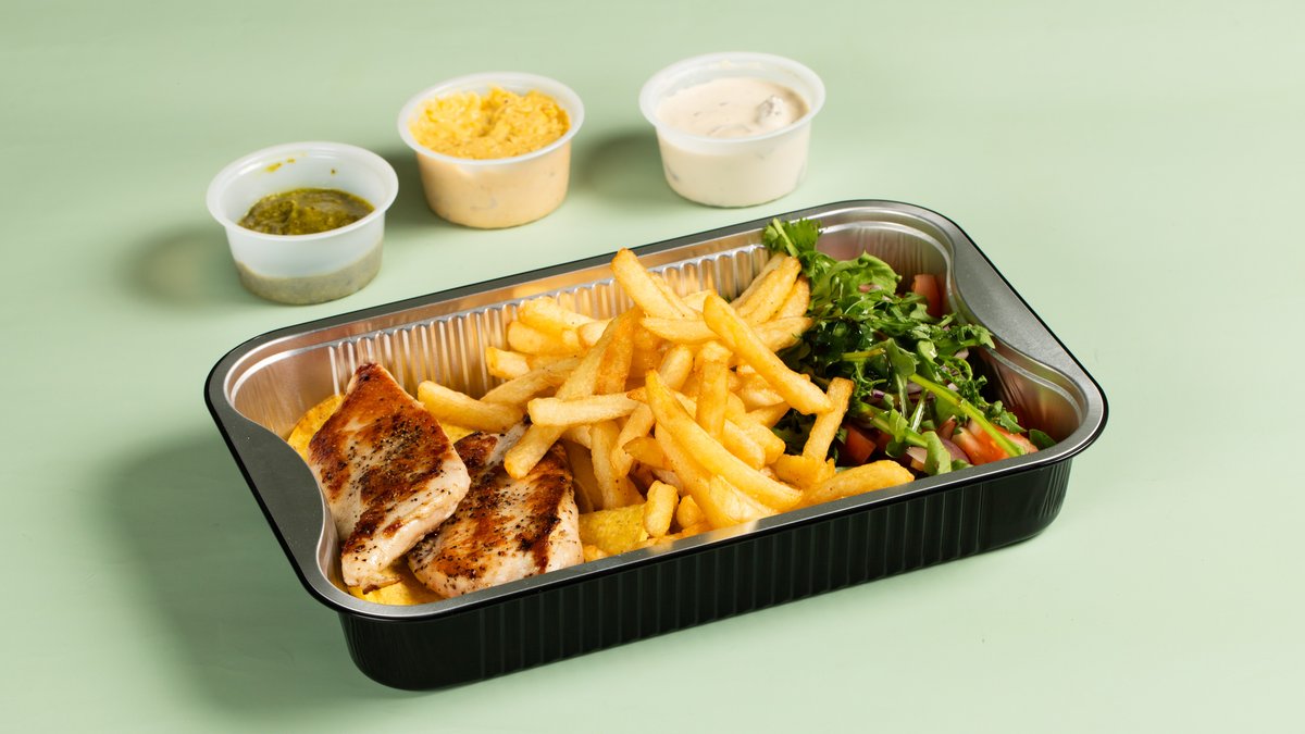 Marinert kylling, salat, brød, hvitløksaus og pommes frites.
