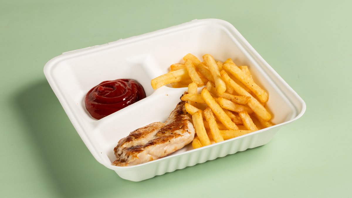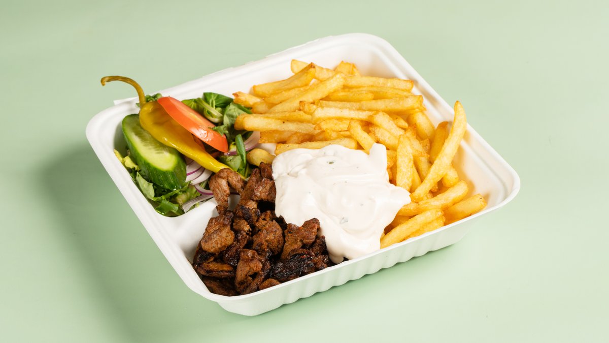 Spyd av marinert kyllingfilet og indrefilet. Serveres med pommes frites, salat og tzatziki.