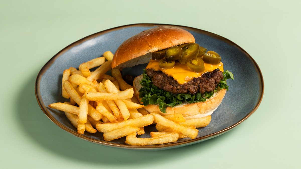 180g burger med hvitløksdressing, hjertesalat, jalapeños, cheddar og pommes frites.