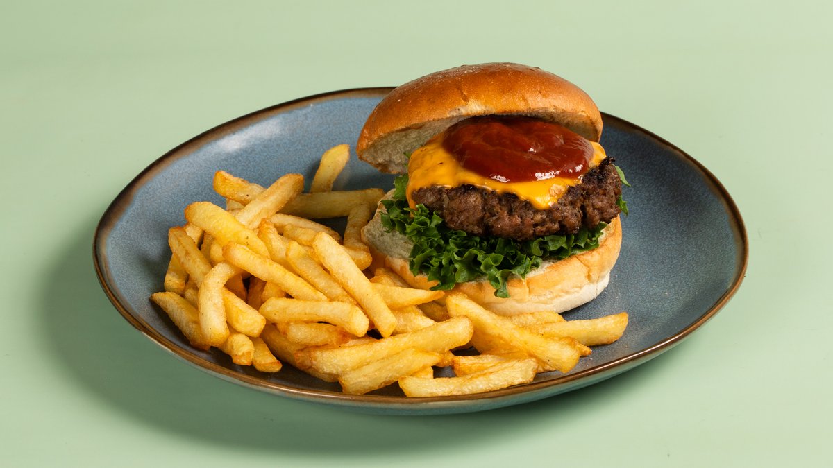 180g burger med hamburgerdressing, hjertesalat, bifftomat, rødløk, sylteagurk, cheddar og pommes frites.