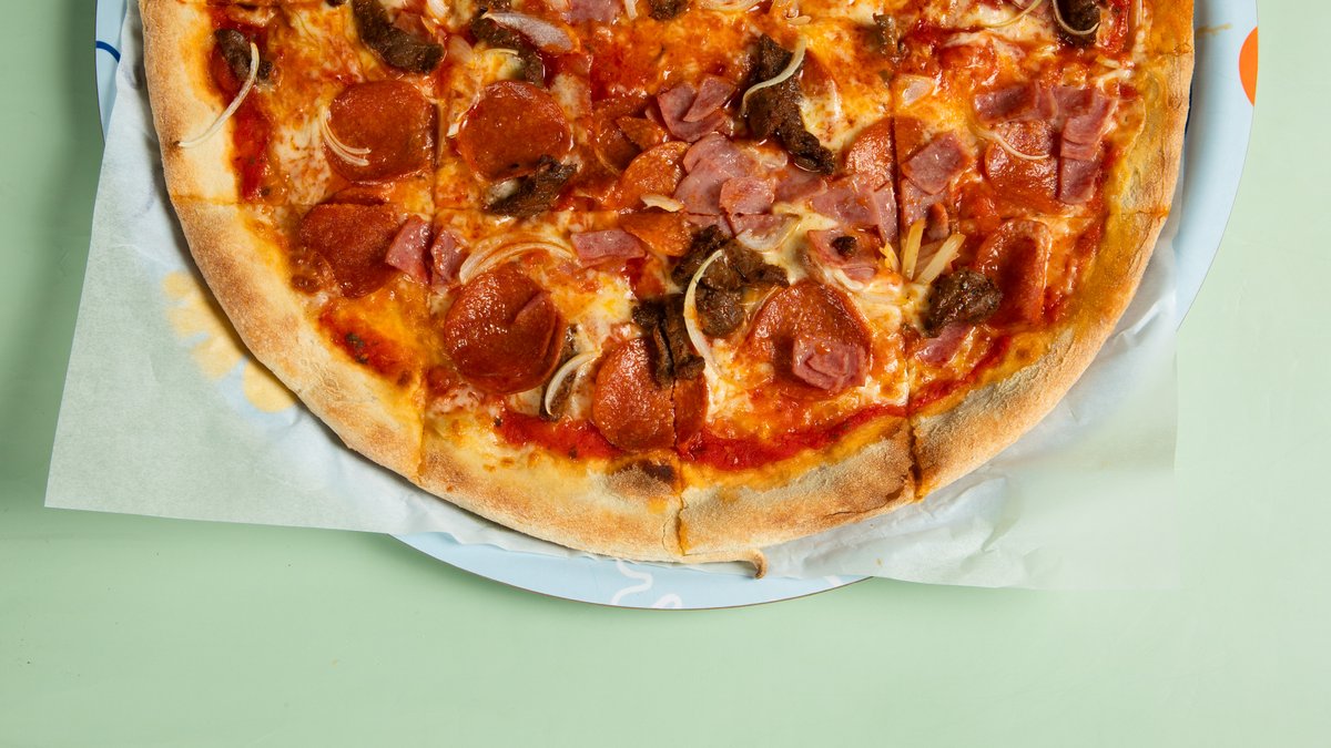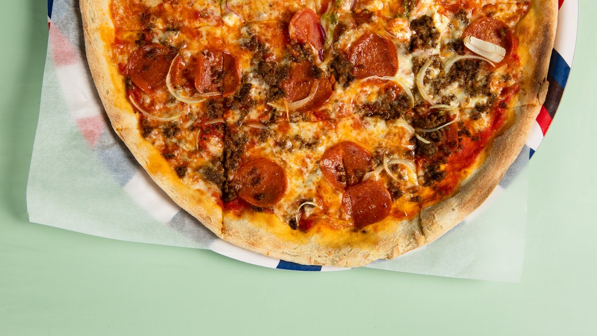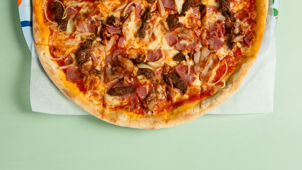 Tomatsaus, mozzarella, skinke, biff, pepperoni og løk.