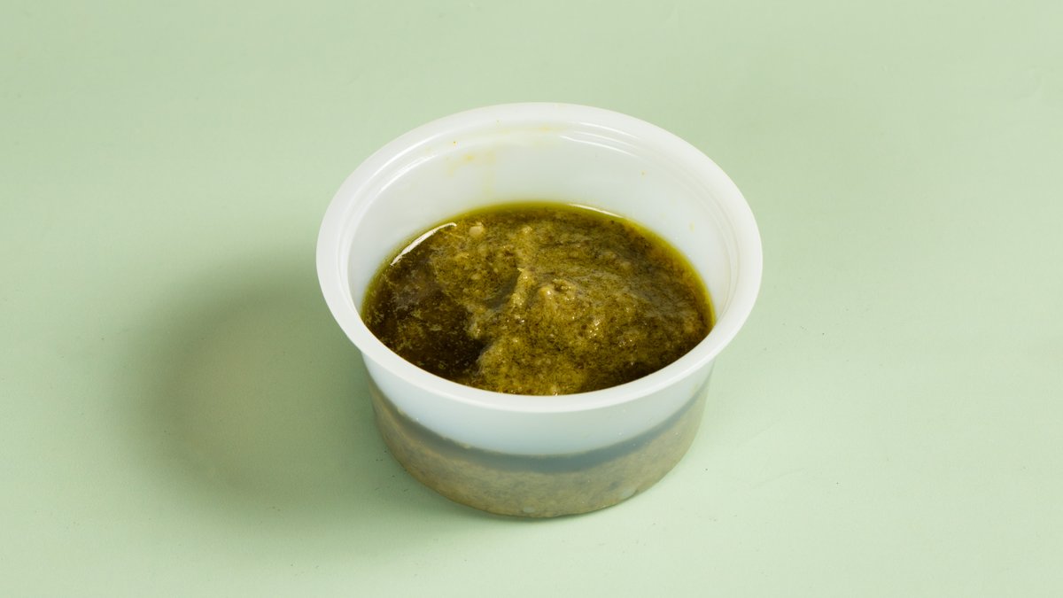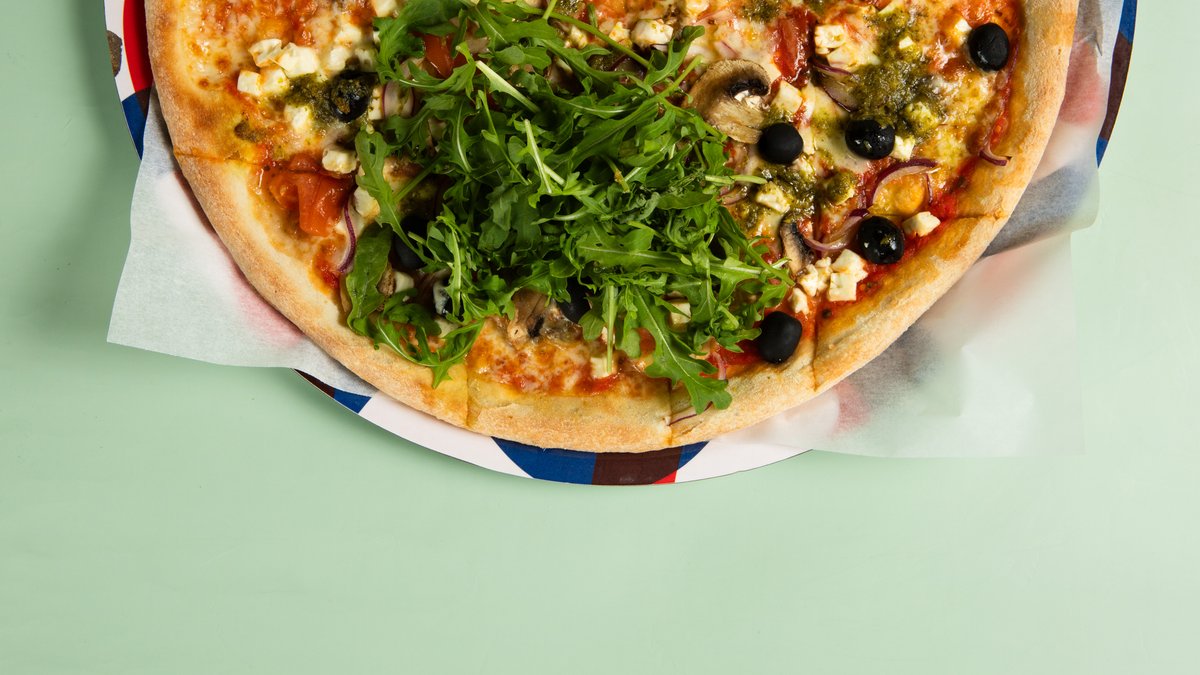 Tomatsaus, mozzarella, ferske tomatskiver, rødløk, oliven, fetaost, champignon, pesto og ruccola.