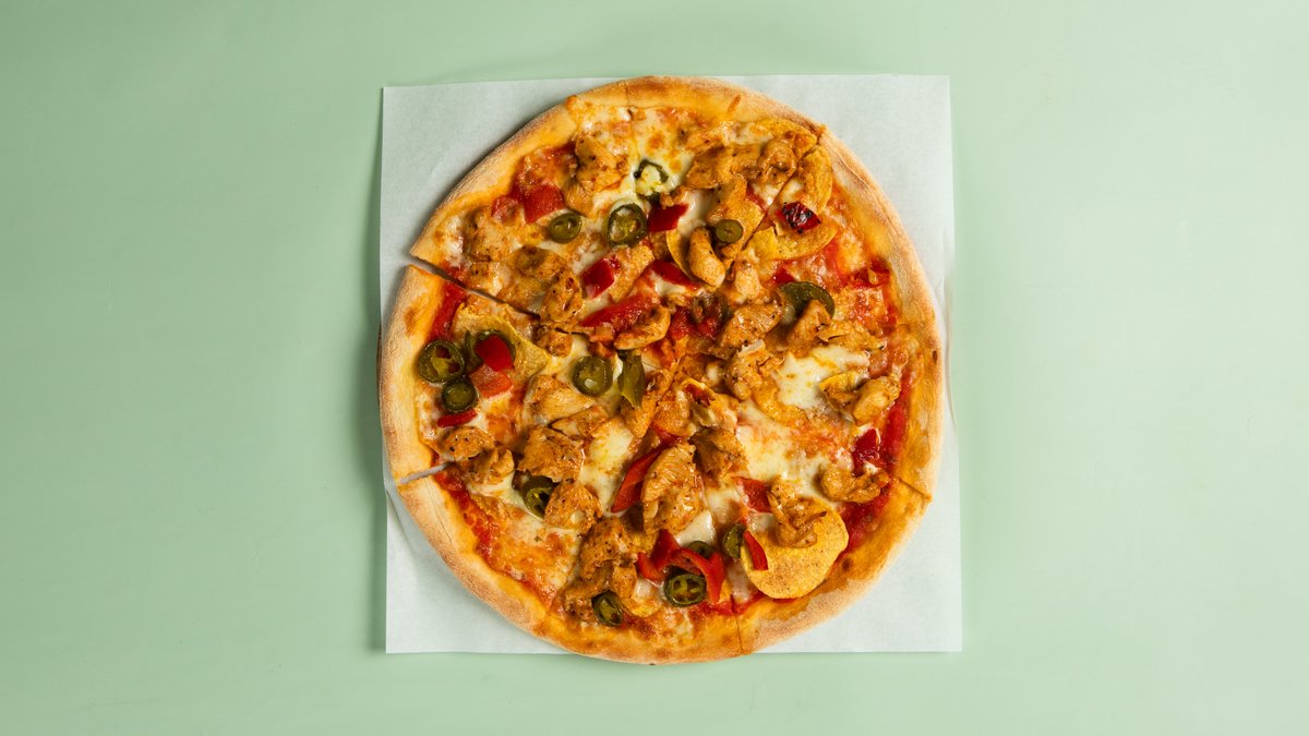 Tomatsaus, mozzarella, kylling, nachos, paprika, jalapeños og hvitløksaus.