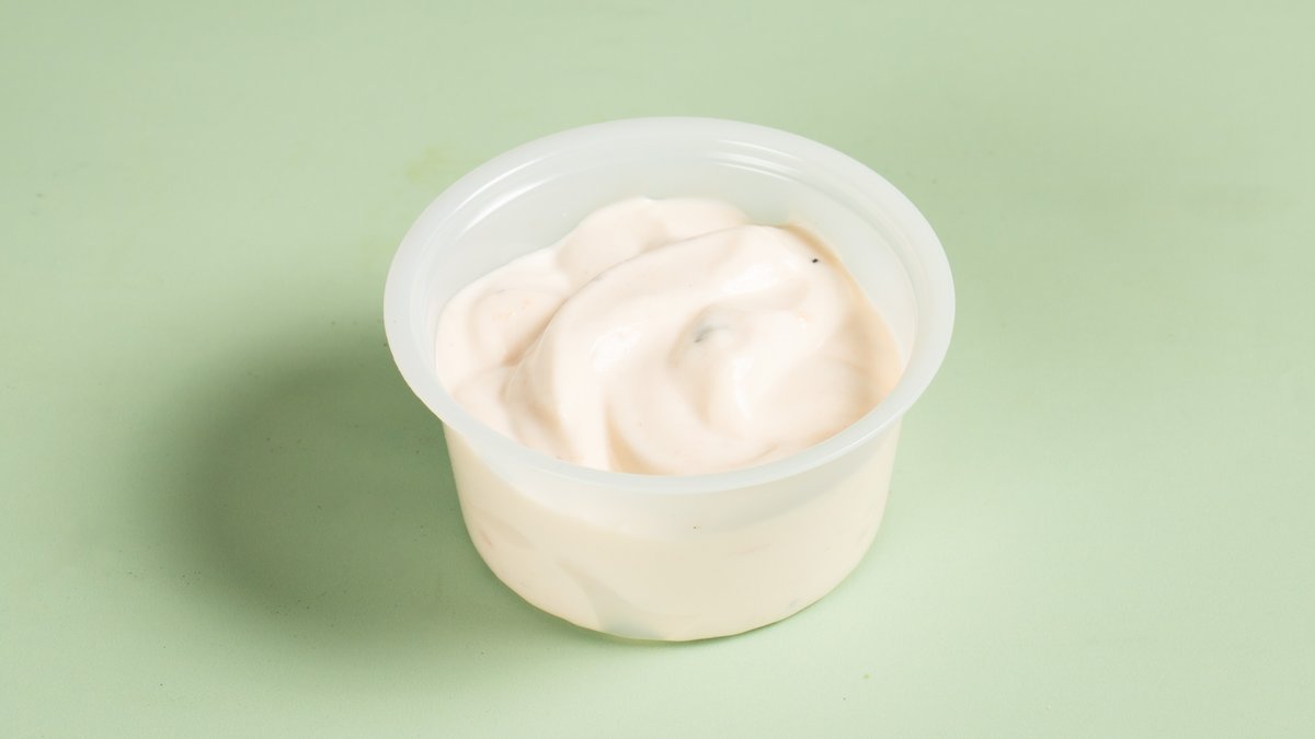 Marinert kylling, salat, hvitløksaus og rullebrød.