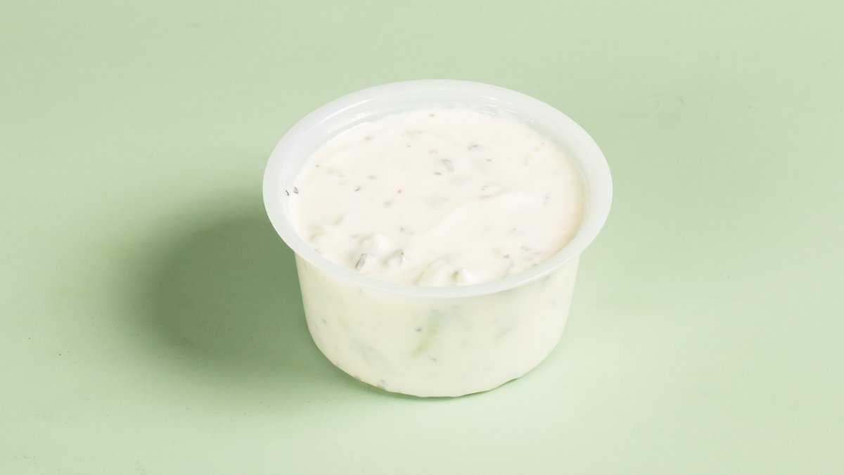 Salat, fetaost, oliven, agurk, cherrytomat, rødløk, ruccola og hvitløksdressing.