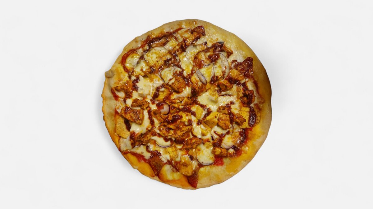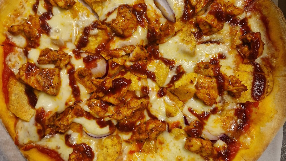Tomatsaus, mozarella, marinert kylling, nachos, rødløk og BBQ