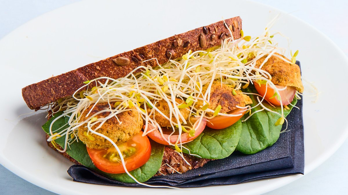 Falafel, guacamole, hummus, tomato, spinach, alfalfa