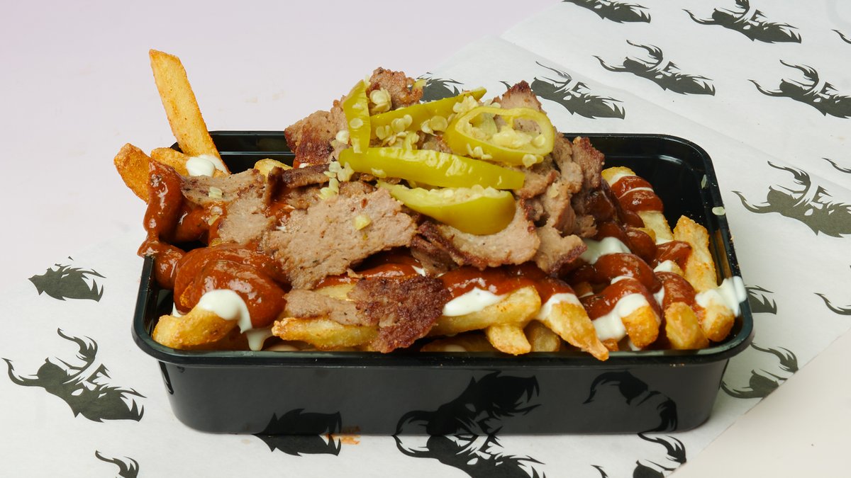 Biffburger, döner kjøtt, hvitløkdressing, cheddardressing, piri piri chili saus, salat, tomat, løk og fefferoni pepper.. Servert med fries og valgfri dip og drikke.