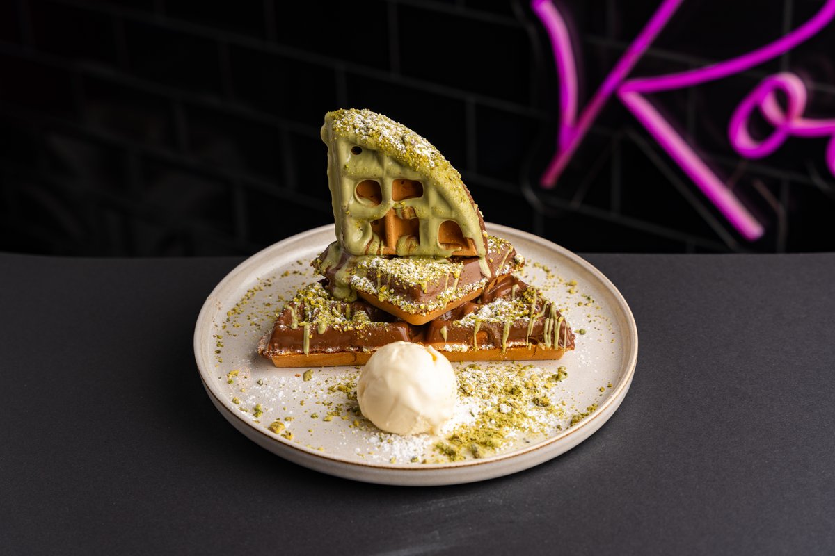 Varm Waffle med knafeh, smeltet belgisk melkesjokolade og pistasjkrem. Følger med en kule vaniljeis