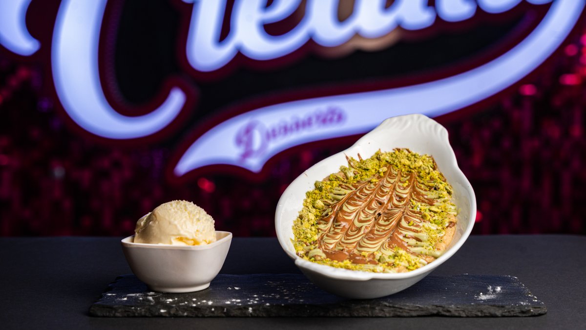 Crepes med Knafeh, smeltet belgisk melkesjokolade og pistasjkrem. Følger med krem.