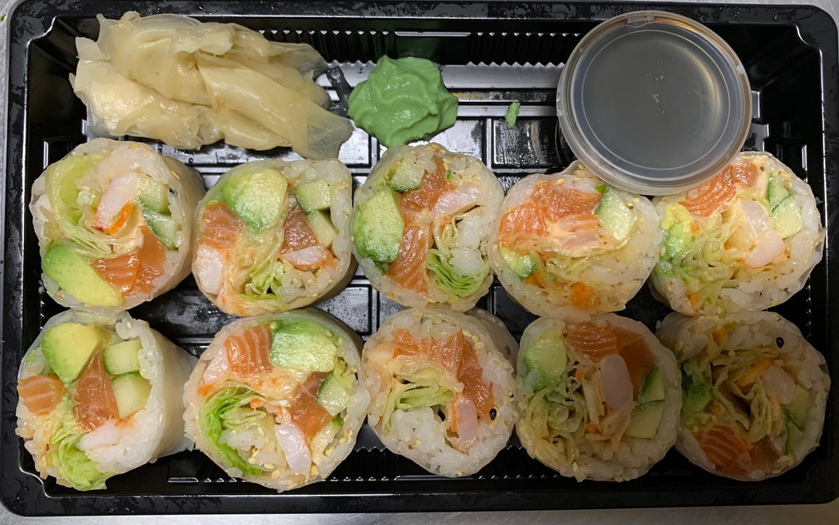 Nigiri : 4 laks , 2 kamkjell , 2 scampi Sashimi : 4 laks , 2 tunfisk Maki : 8 spicy laks maki , 6 tempura maki. 2 vårruller , 2 innbakt scampi .