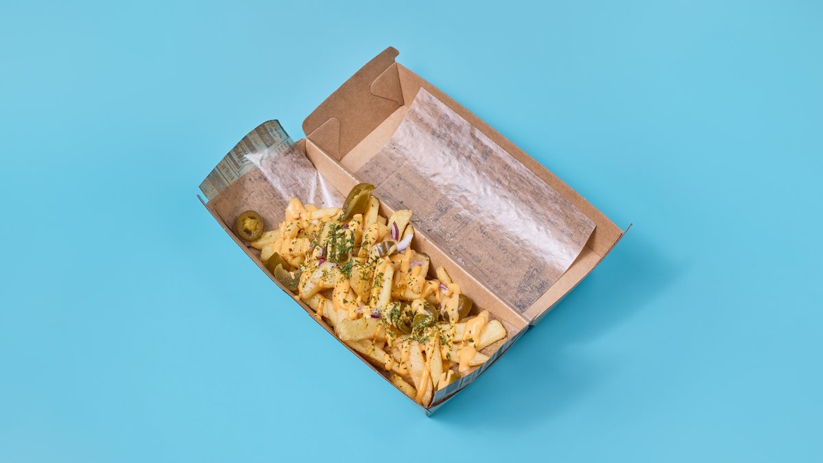 Pommes frites toppet med chili & cheddar-saus, jalapeño, rødløk og persille.