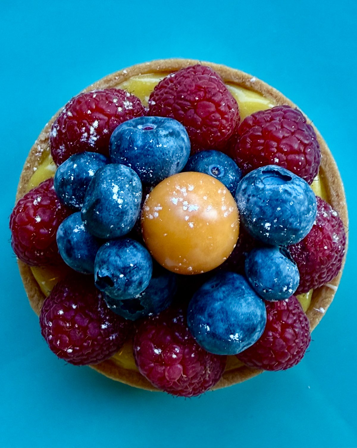 Nyt vår Sitronterte - en perfekt balanse av syrlig sitron, toppet med ferske bringebær, blåbær og eksotiske physalis. En søt og frisk avslutning!