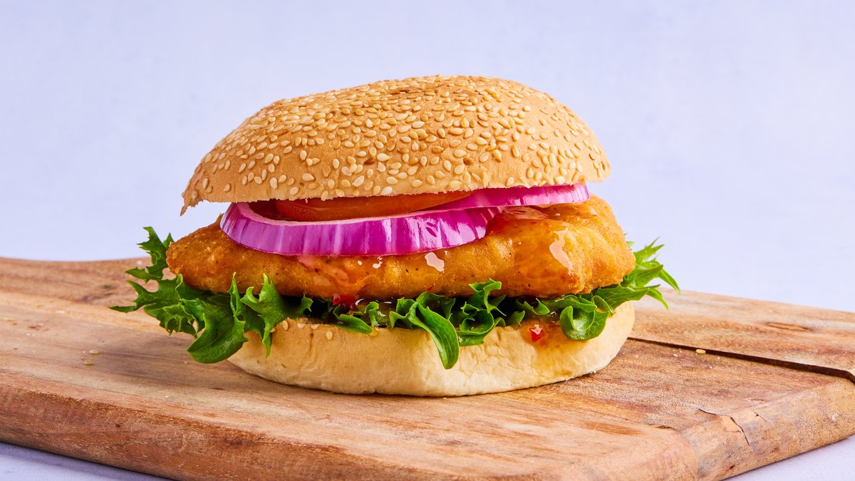 Fiskeburger med salat, mais, rødløk, tomat, syltetagurk og dressing.