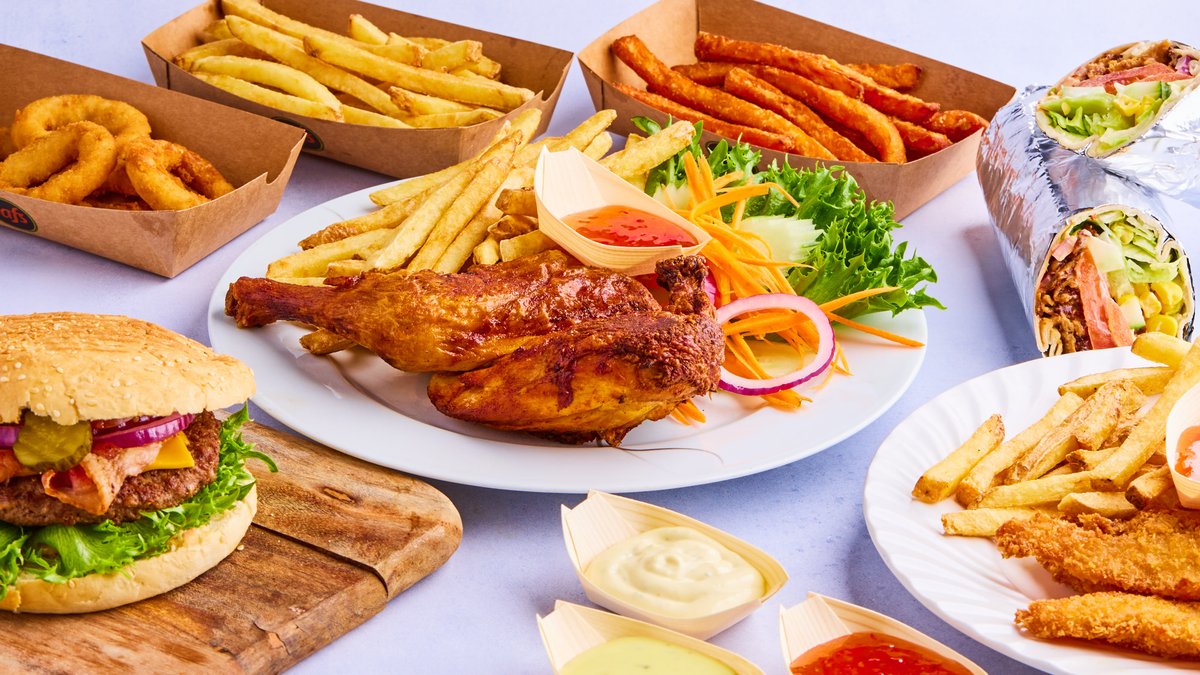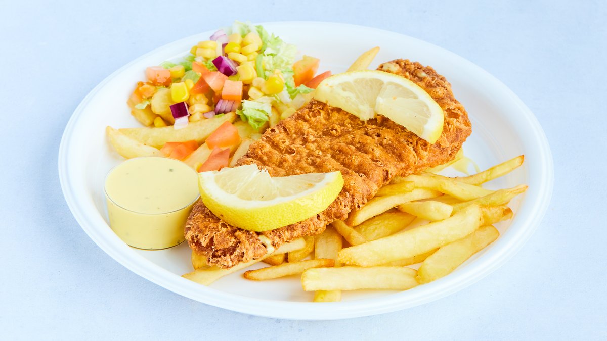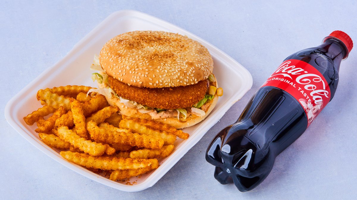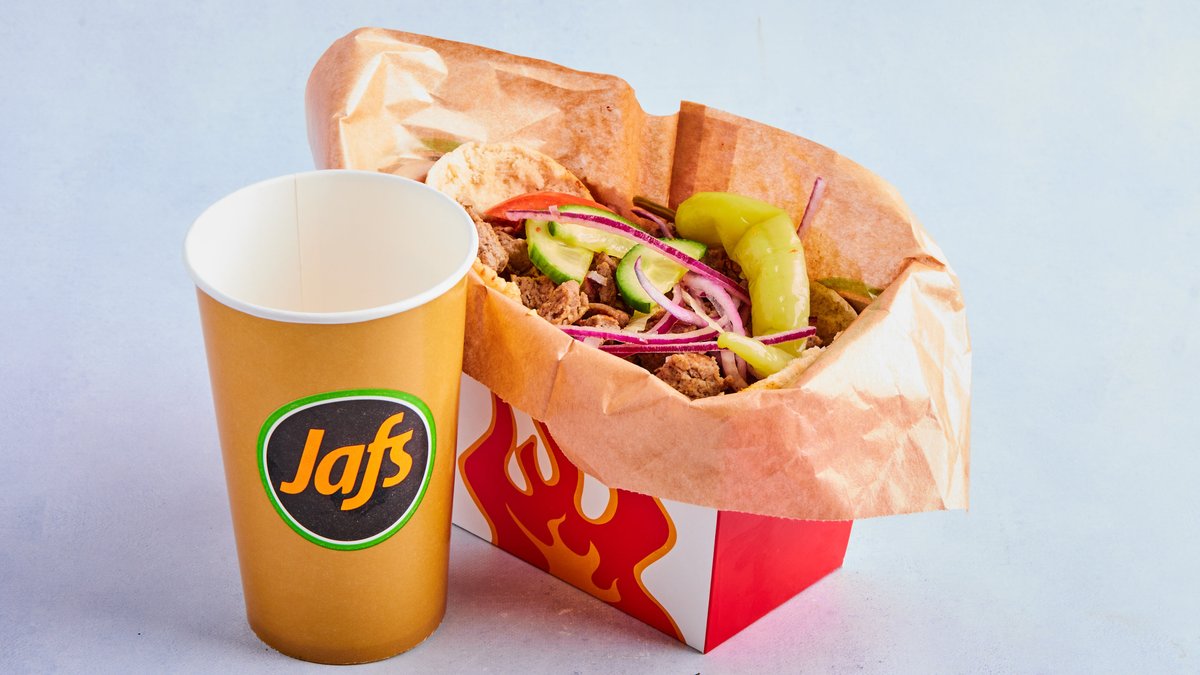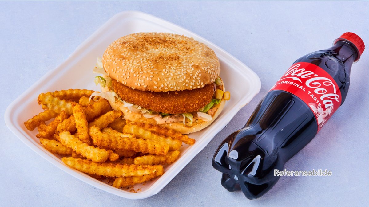 Jafsburger med salat, mais, rødløk, tomat, syltetagurk, dressing og pommes frites. Velg størrelse.
