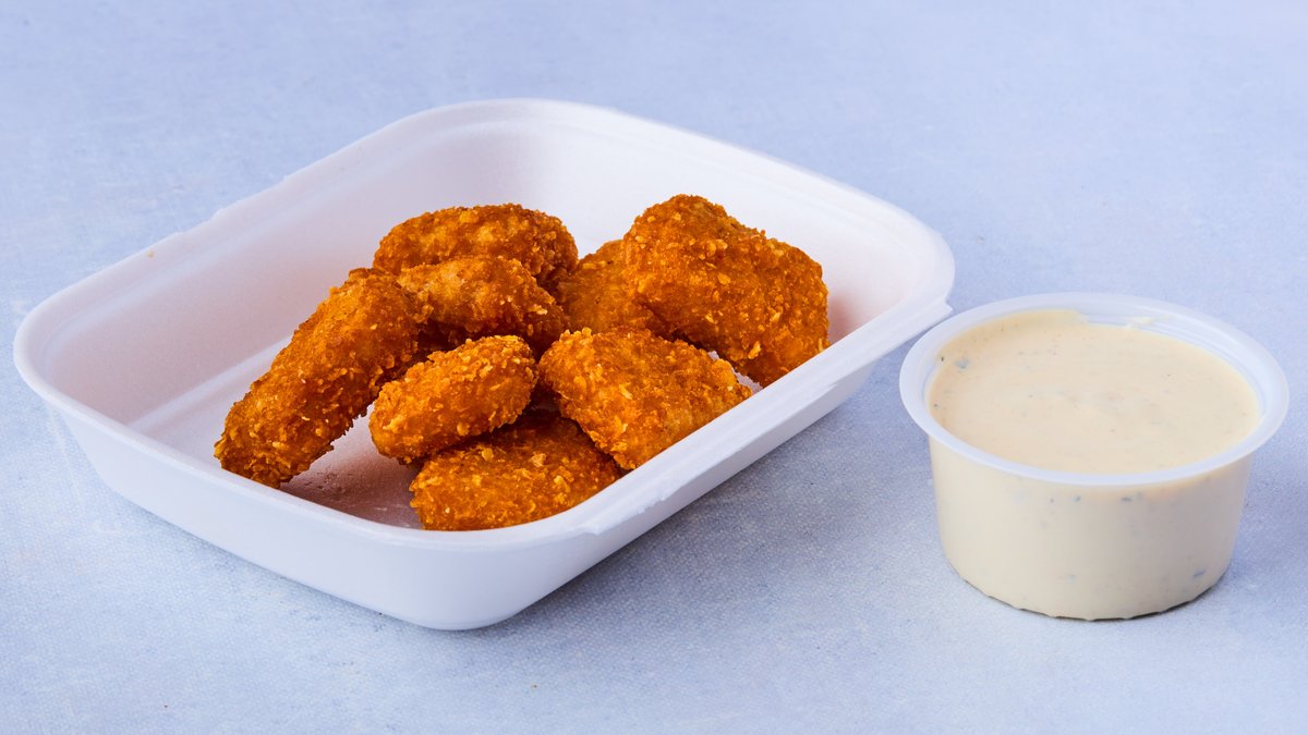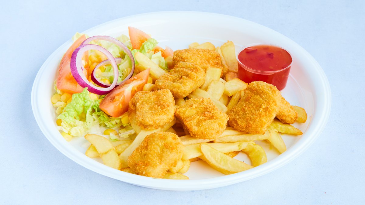 8 Stk vegetar nuggets. Serveres med salat og pommes frites.