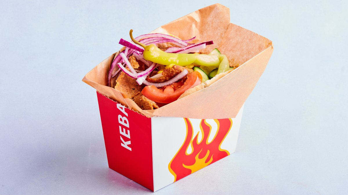 Kebabkjøtt, salat, mais, rødløk, tomat og slangeagurk. Velg mellom pita eller rull.