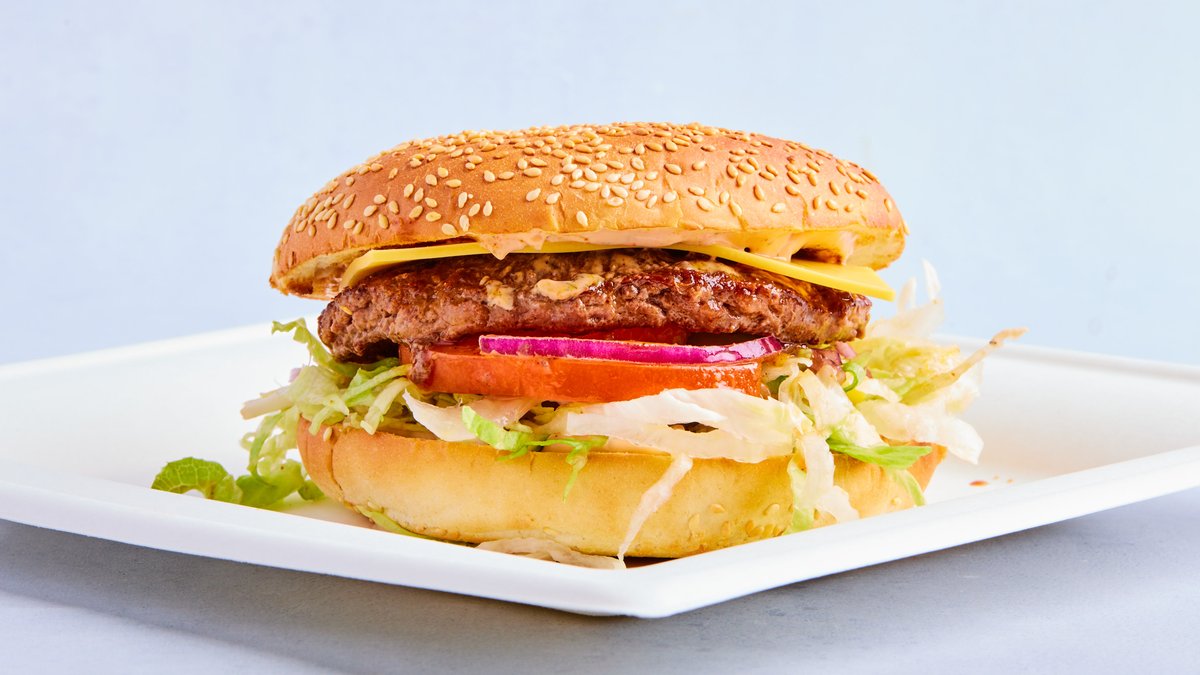 Biffburger med salat, mais, rødløk, tomat, syltetagurk og dressing. Velg størrelse.