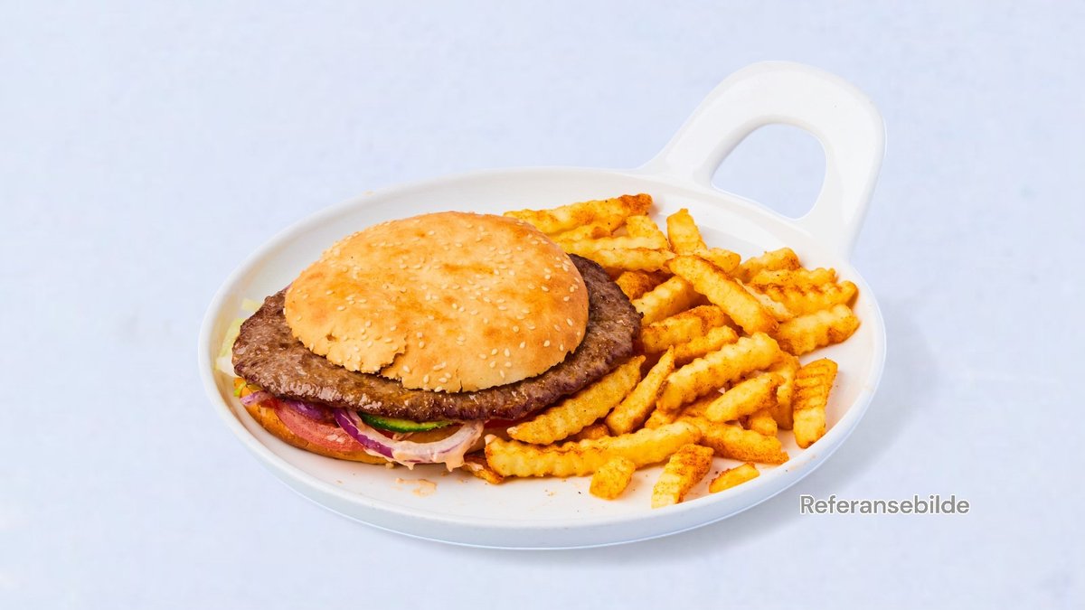 Løvstekburger med salat, mais, rødløk, tomat, syltetagurk, dressing og pommes frites. Velg størrelse.