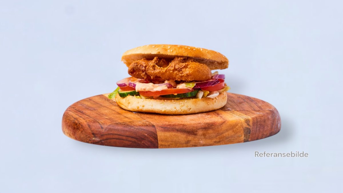 Hamburger med salat, mais, rødløk, tomat, syltetagurk og dressing. Velg størrelse.