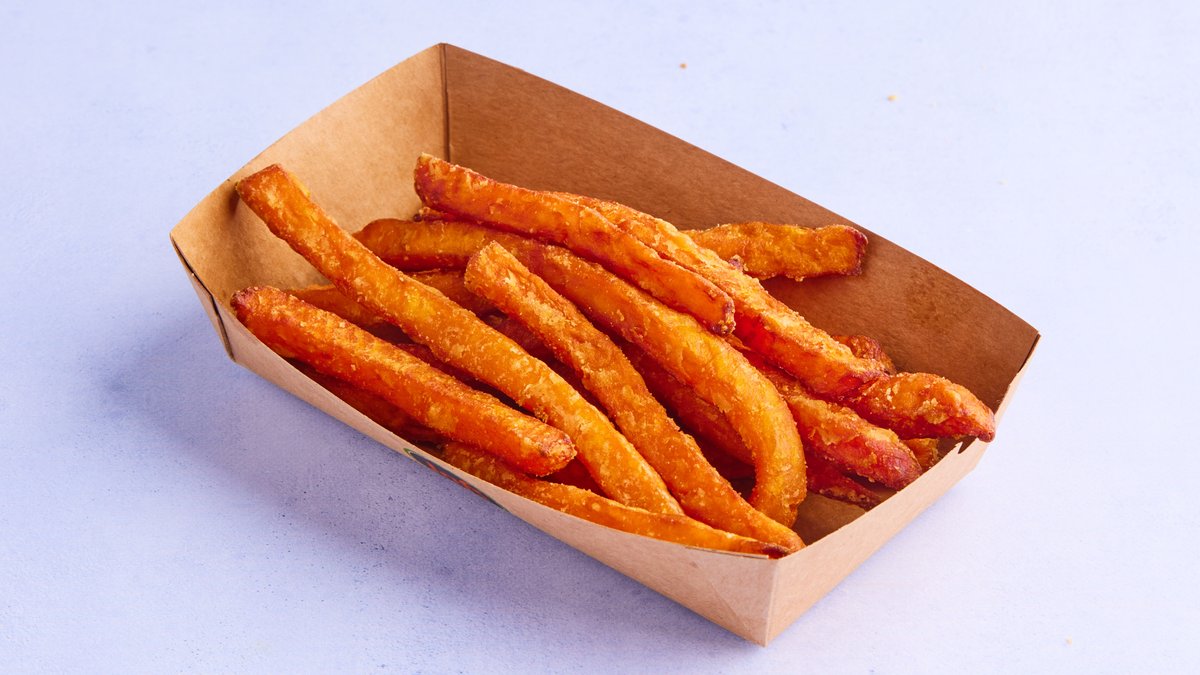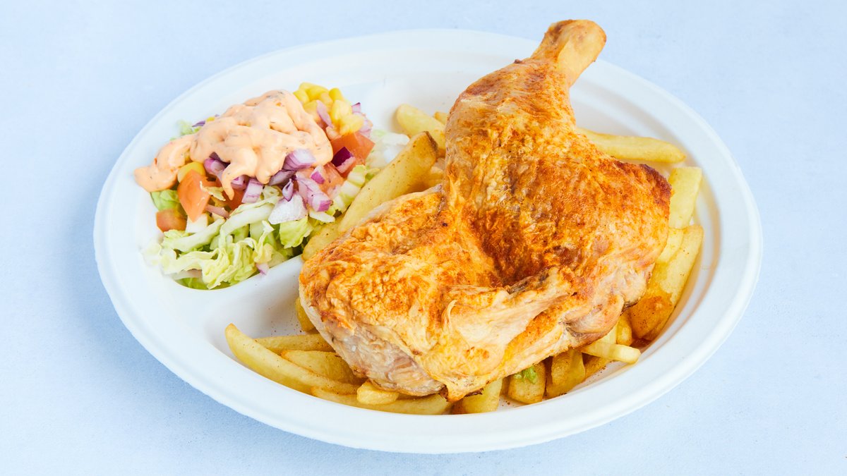 Salat, mais, rødløk, tomat og slangeagurk. Serveres med pommes frites.