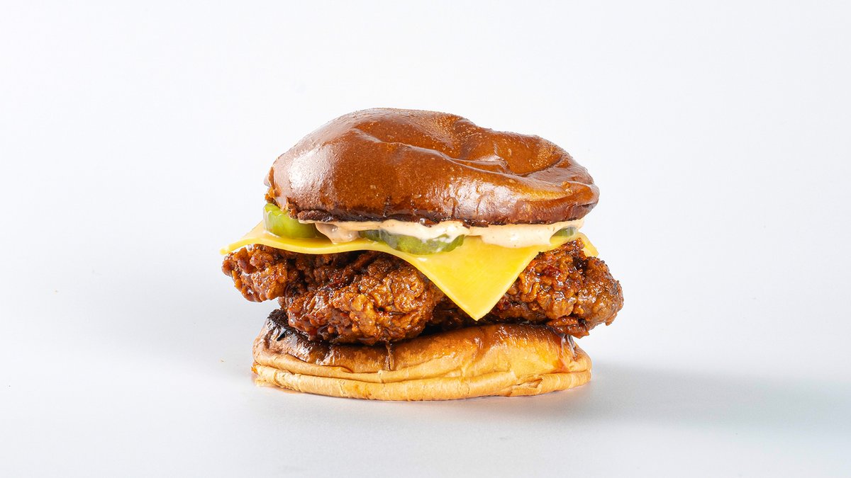 Økologisk briochebrød, kjernemelkstekt kyllinglår, majo, chipotle majo, sylteagurk og salat. Serveres med pommes frites, en dip etter eget valg og brus etter eget valg.