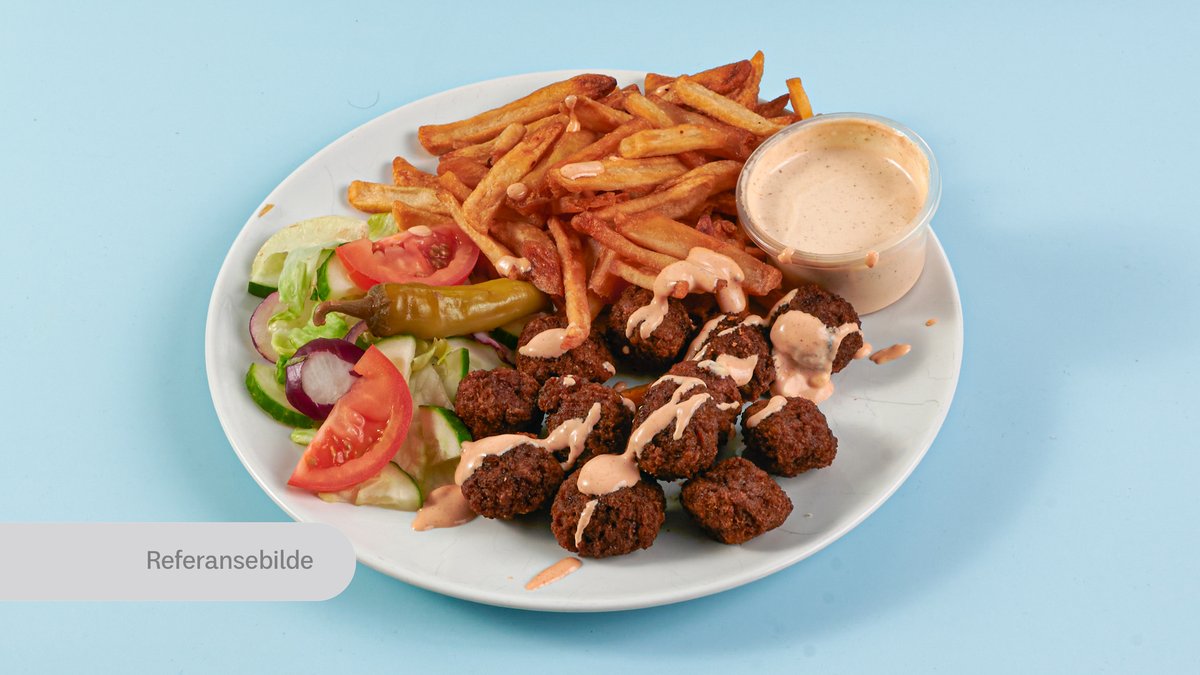 Falafeltallerken med falafel, salat, mais, løk og dressing. Serveres med salat og pommes frites. Velg styrke.