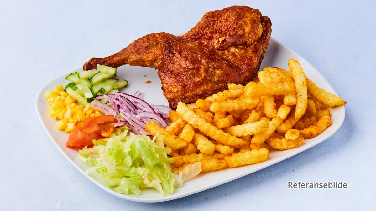 En halv grillet kylling med salat, mais, dressing og pommes frites