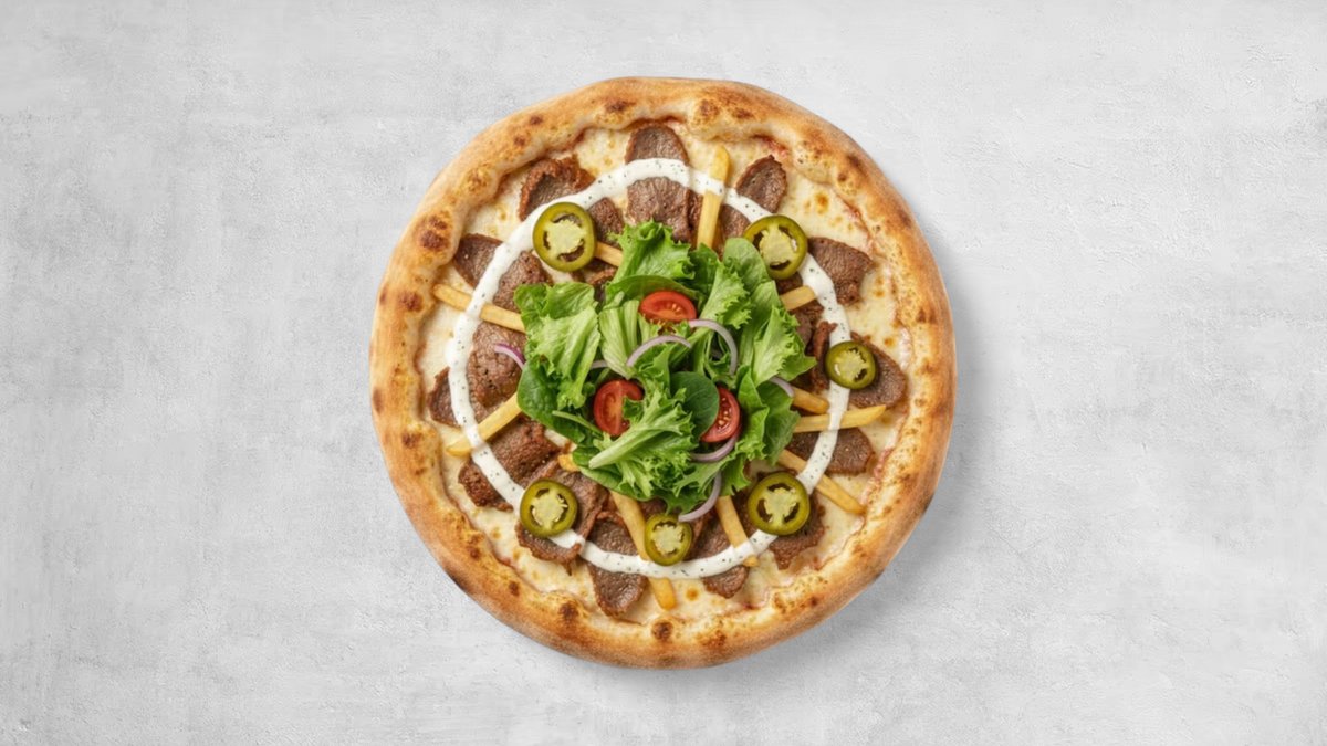 Mozzarella, Pizza Sauce Kebab Meat, Fresh Onion, Pickle Chili, Frise Topping Kebab Sauce