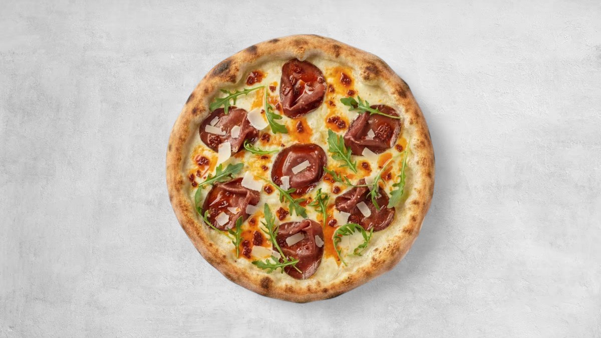 Mozzarella, Fenalår, Sun Dry Tomato Pesto, Rúcula, Parmesano Oil, Pizza Sauce
