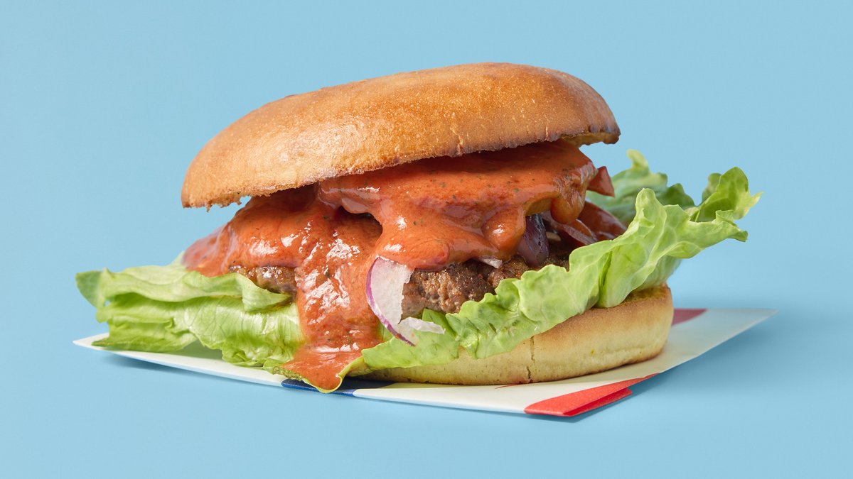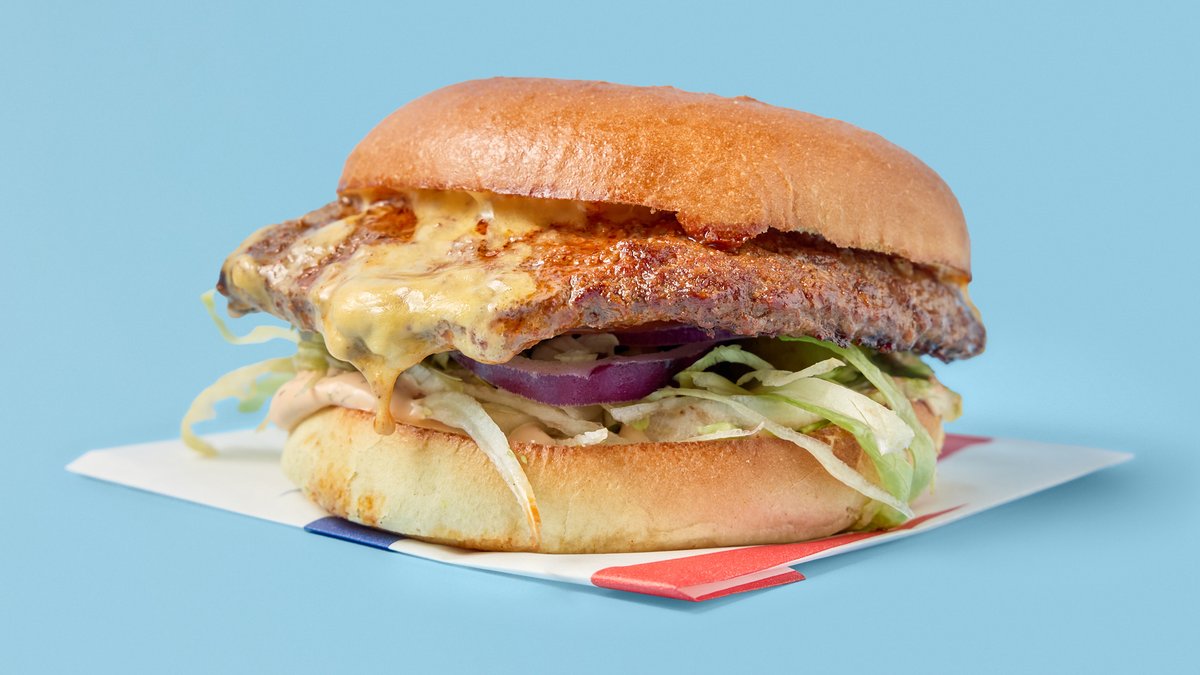Smash-storfekjøtt, cheddar, spesialsaus, sterksaus, salat, løk, tomat og jalapeños.