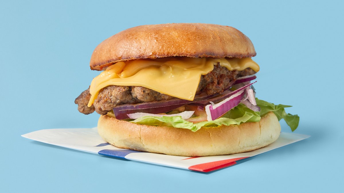 Smash-storfekjøtt, cheddar, spesialsaus, salat, løk og tomat.