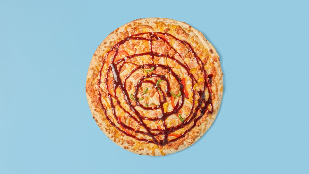 Tomatsaus, ost, mozzarellastrimler, løk og BBQ-saus.