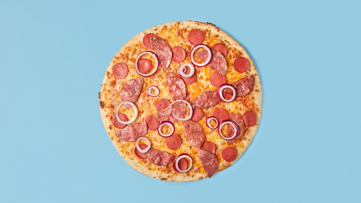 Tomatsaus, pepperoni, paprika og løk.