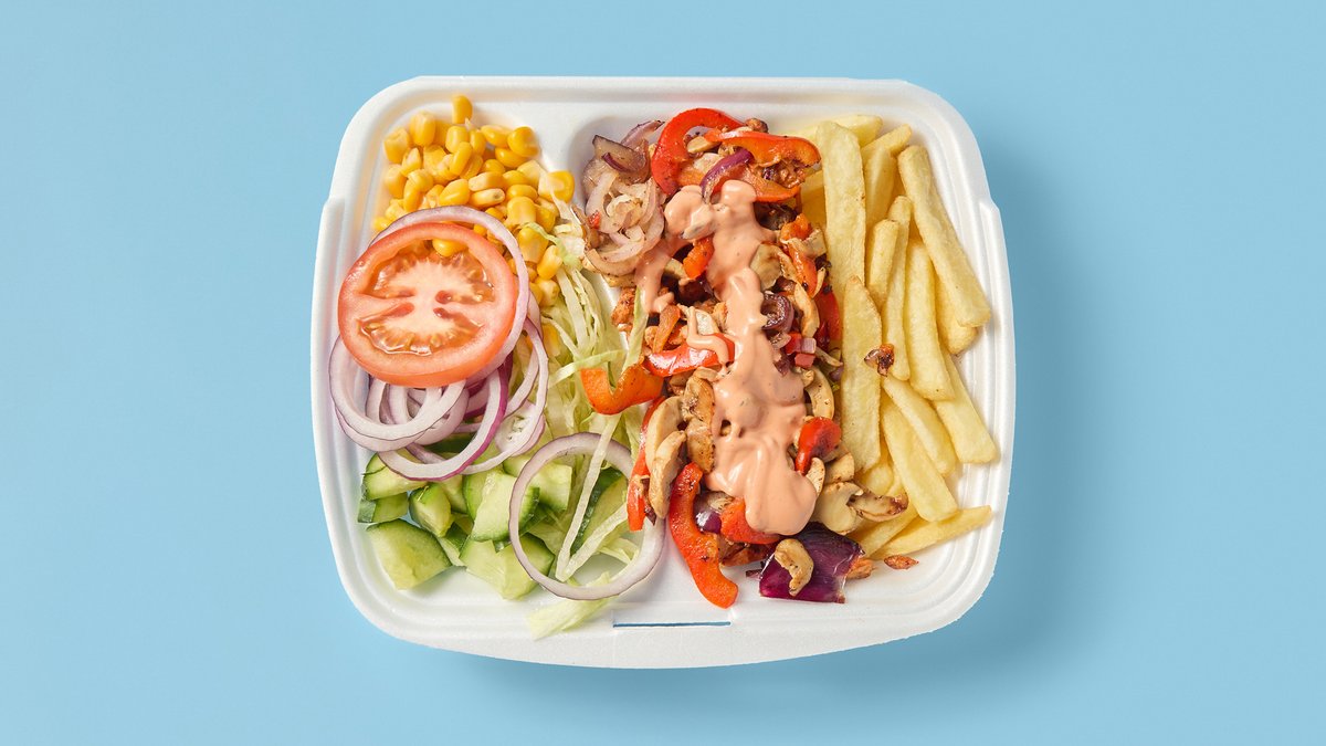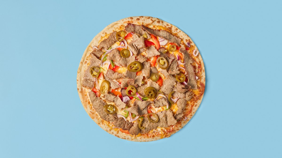 Tomatsaus, ost, mozzarella, donerkjøtt, paprika, løk, jalapeños og kebabsaus.