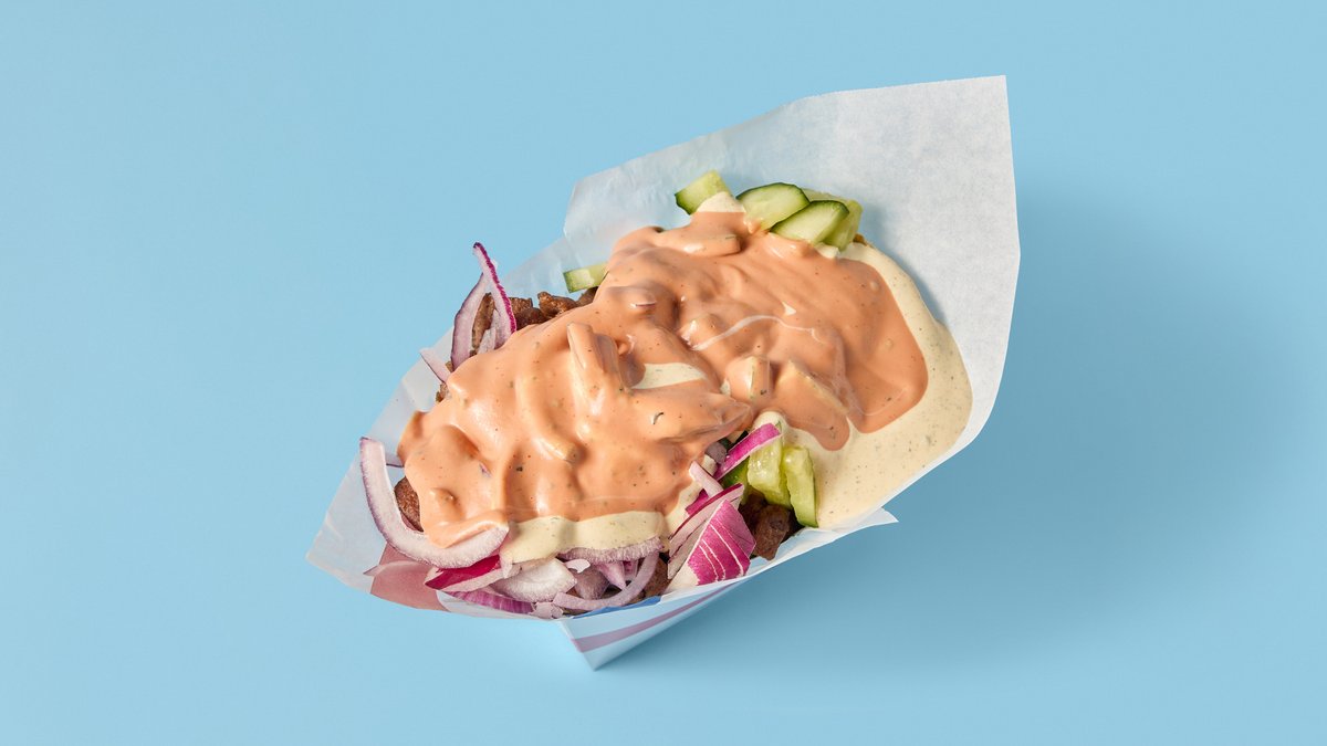 Storfekjøtt, ost, karamellisert løk, paprika, pommes frites og spesialsaus.