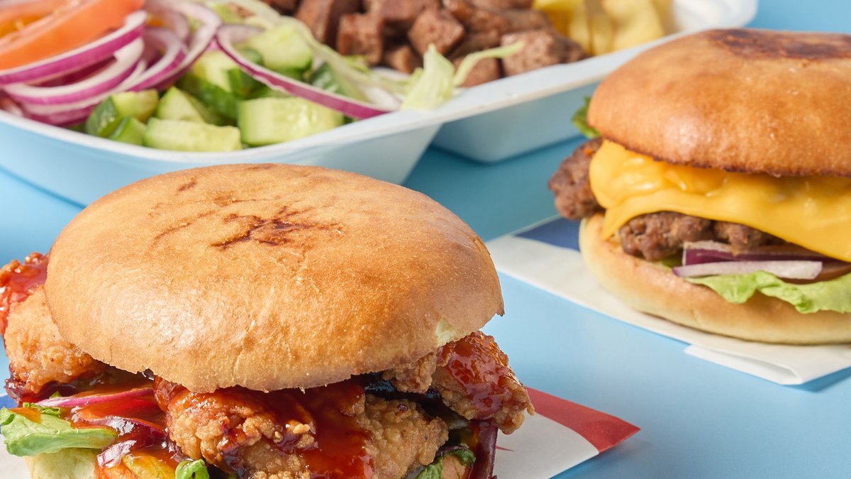 Vegansk burger, spesialsaus, salat, løk og tomat.