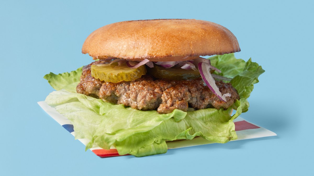 Klassisk hamburgerkjøtt, spesialsaus, salat, løk og tomat.