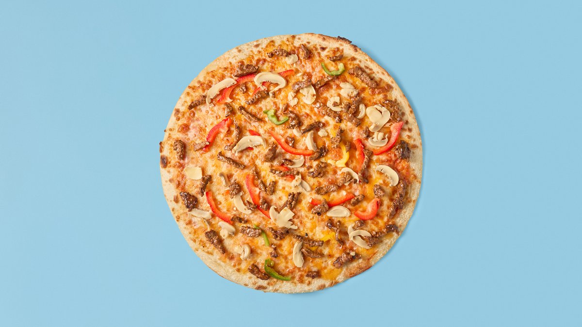 Tomatsaus, ost, marinert storfekjøtt, løk og paprika.