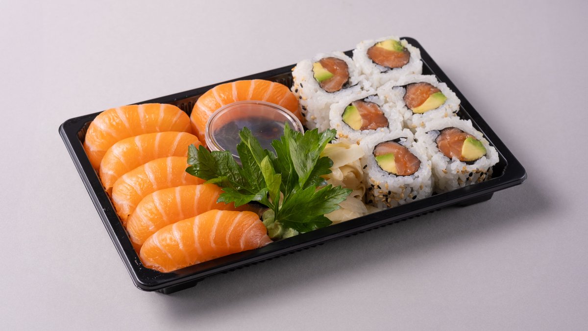 22 biter. Nigiri: 2 laks, 2 halibut, 1 tuna, 1 kamskjell, 1 scampi og 1 rødskjell. Sashimi: 4 laks og 4 tuna og 6 tempura maki.